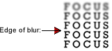 Remove your glasses. Get as close as you need to the screen to see the word ‘focus’, below, sharply. Slowly move your head back till ‘focus’ looks blurred, as indicated red arrow in the sample image. This is the ‘edge of blur’. Stop, record the exact distance in centimeters from your eyes to the screen.